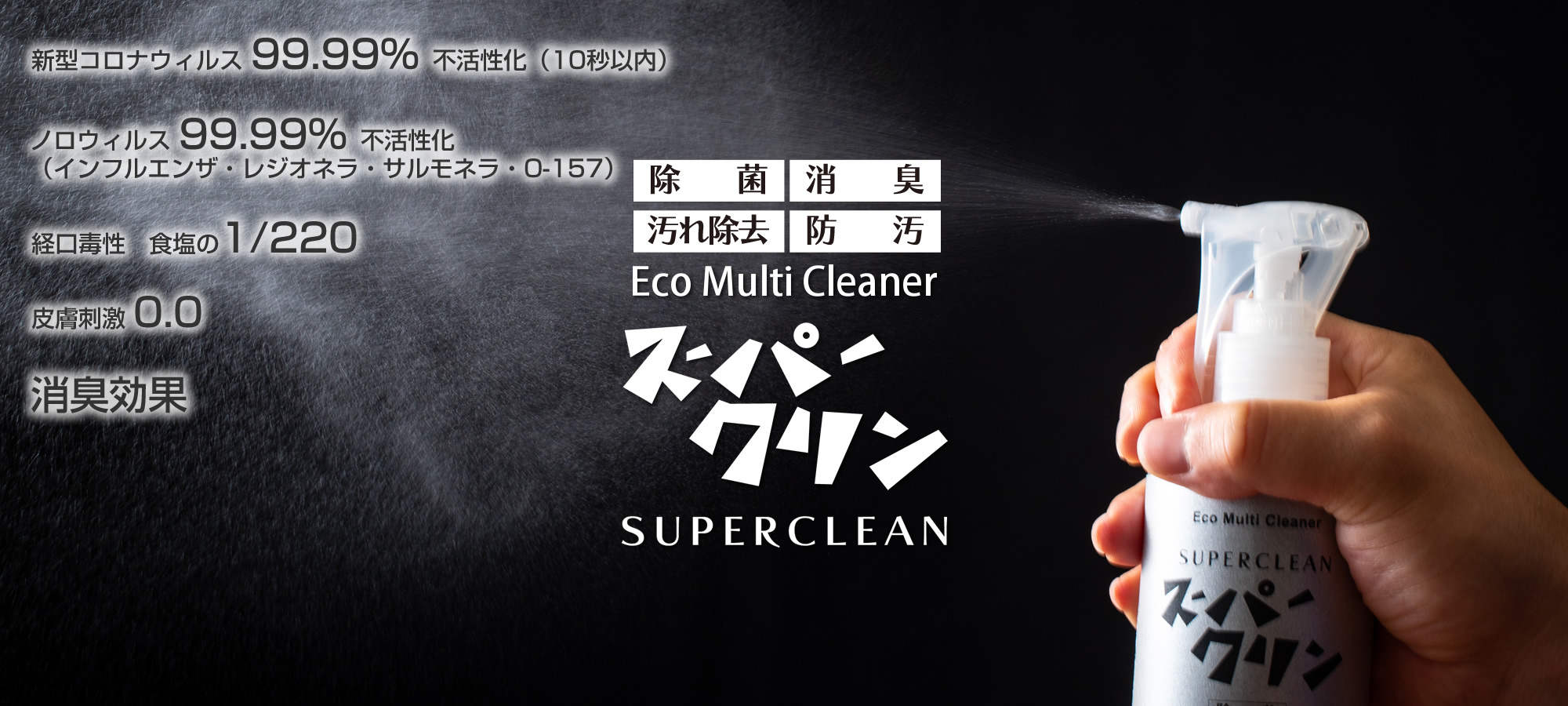 - スーパークリン - は除菌・洗浄・消臭オールインワンのマルチクリーナー。 アルコールでは「除菌」はしていますが「汚れ」が落ちておらず「伸ばしているだけ」そこがウィルスの温床となり、さらにウィルスが再付着し広がります。スーパークリンは「除菌」だけでなく「汚れ」も落とし、「消臭」もできます。さらには「手荒れ」もすることなく口に誤って入っても大丈夫な、人・モノ・環境にやさしいエコクリーナーです。